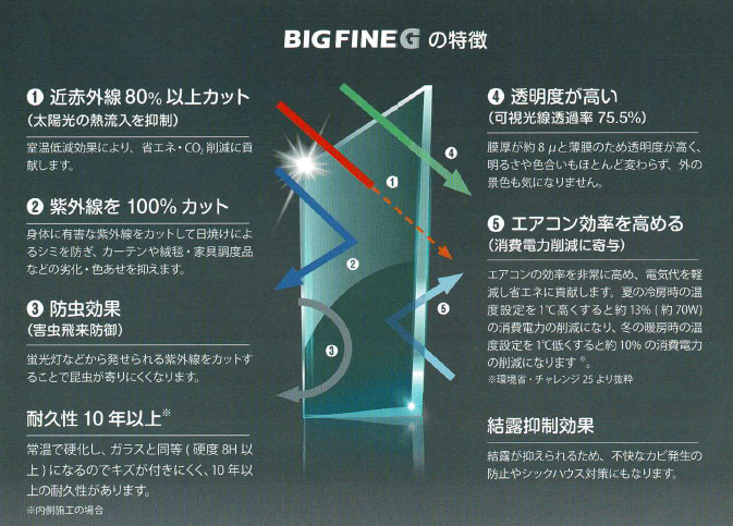 既存の窓ガラスに塗布することで、高い遮熱性能と省エネ効果を発揮する透明断熱コーティング材です。日射によるガラス内部への熱侵入を抑制し、 夏場の室内温度上昇を軽減。空調負荷を下げることで、電力使用量の削減・快適な室内環境の維持に貢献します。また、既存ガラスを活かす工法のため、ガラス交換が不要で短工期・低コストでの施工が可能です。